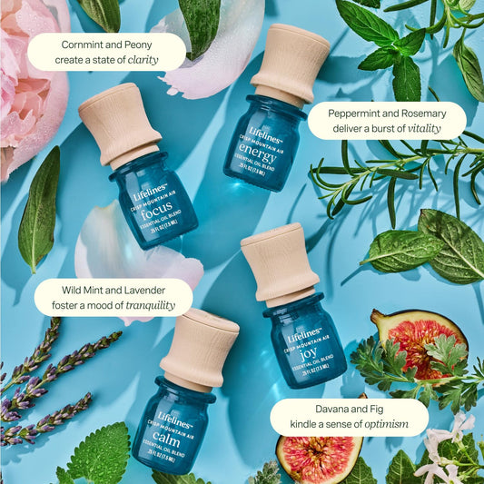Lifelines Essential Oil Blends, 4-Pack - Blended Essential Oils with Precision Pump for Aromatherapy Diffusers - Long-Lasting Scented Fragrance - Crisp Mountain Air (Joy, Calm, Focus & Energy)