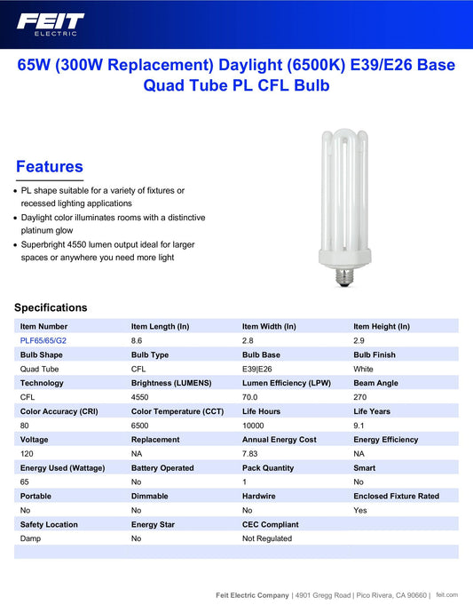 Feit Electric CFL Quad Tube Light Bulb, 300W Equivalent, E26 Base with Mogul Base Adapter, 65-Watt CFL Light Bulb for Residential & Commercial Use, 6500K Daylight, 10,000-Hour Lifespan, PLF65/65/G2