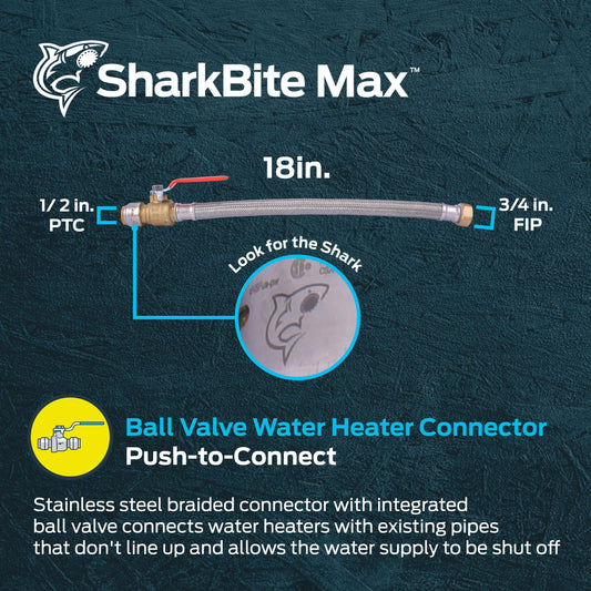 SharkBite Max 3/4 Inch Ball Valve x 3/4 Inch FIP x 18 Inch Stainless Steel Braided Flexible Water Heater Connector,Push to Connect Brass Plumbing Fitting,PEX Pipe, Copper, CPVC,PE-RT,HDPE,UR3088FX18BV