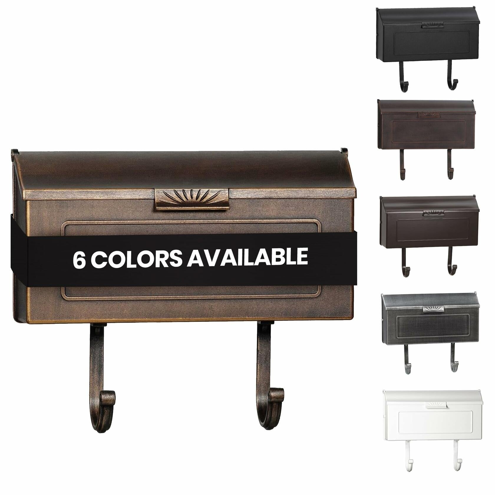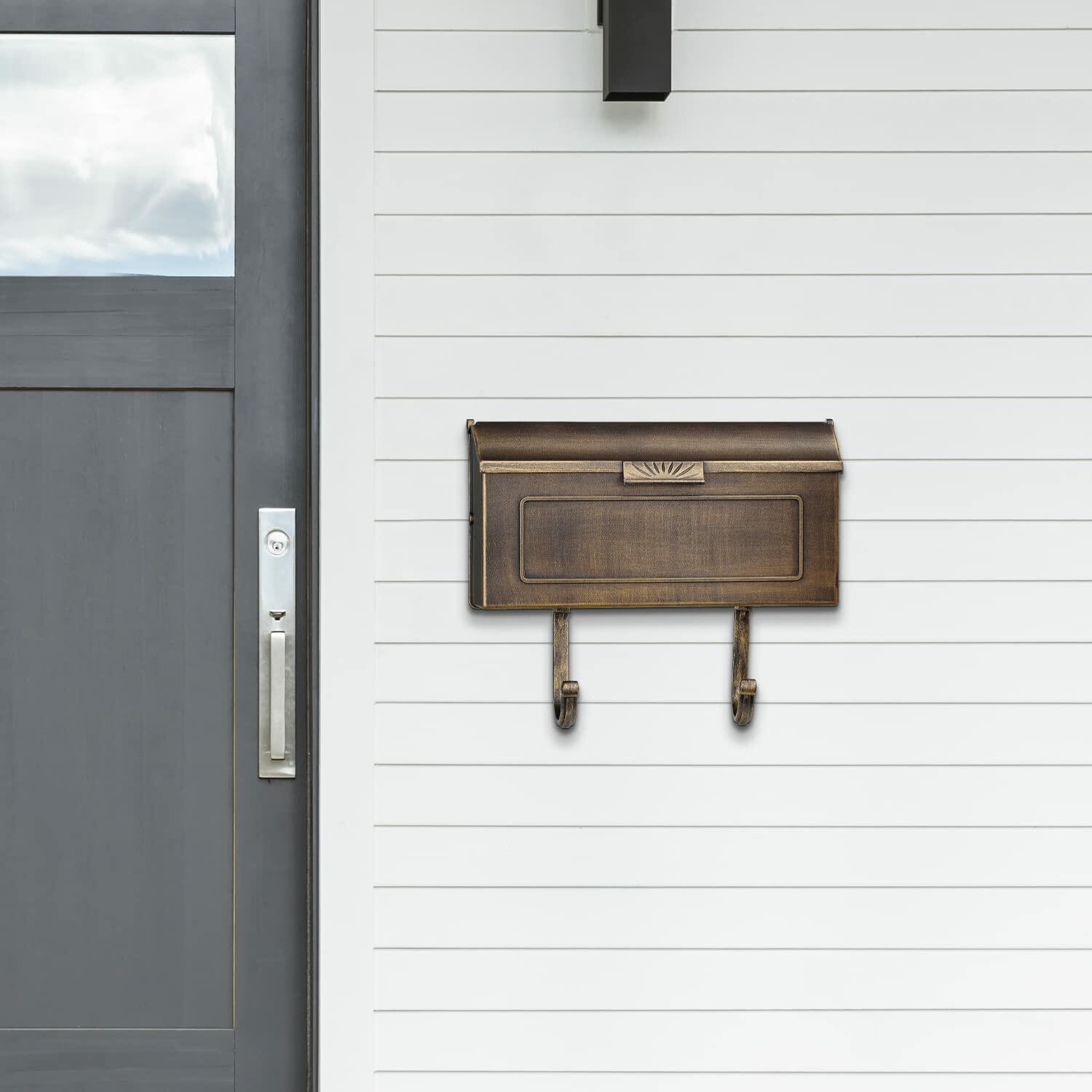 Elevate your home's exterior with our elegant wall mount mailbox. Made from 100% corrosion-resistant cast aluminum, this is ideal for coastal areas and ensure long-lasting durability. The rustproof construction of both the heavy duty mailbox and newspaper hooks guarantees they will maintain their integrity and charm over time, providing you with peace of mind and enduring functionality. Our wall mounted mailboxes features a powder-coated finish, offering optimal protection against harsh weather conditions while maintaining a beautiful, sleek look. This finish adds an extra layer of elegance to your home's entrance, effortlessly enhancing your curb appeal. With their timeless design, the front porch mailbox not only serve practical purposes but also contribute to a sophisticated exterior aesthetic. Installing these items is incredibly easy with the included hardware and clear instructions. The wall mount mailbox features two embossed holes on the rear panel, ensuring a secure wall mount. This hassle-free installation process means you can quickly and effortlessly upgrade your home's exterior without any headaches. This complete bundle includes a medium compartment wall mailbox, perfect for holding bundled mail and small parcels. The wall mounted mailbox also comes with two newspaper hooks for added convenience, allowing you to keep your mail and newspapers organized in style. The included installation instructions and mounting hardware, which include screws and plastic anchors for brick and other masonry installations, ensure you have everything you need for a seamless setup. Enhance your home's entrance with the traditional design of our coordinated wall mailbox and newspaper hooks set. The timeless look adds a touch of sophistication, making a stylish statement that will impress your guests and elevate your curb appeal. Upgrade your home with our Wall Mount Mailbox and enjoy the perfect blend of style, durability, and practicality.