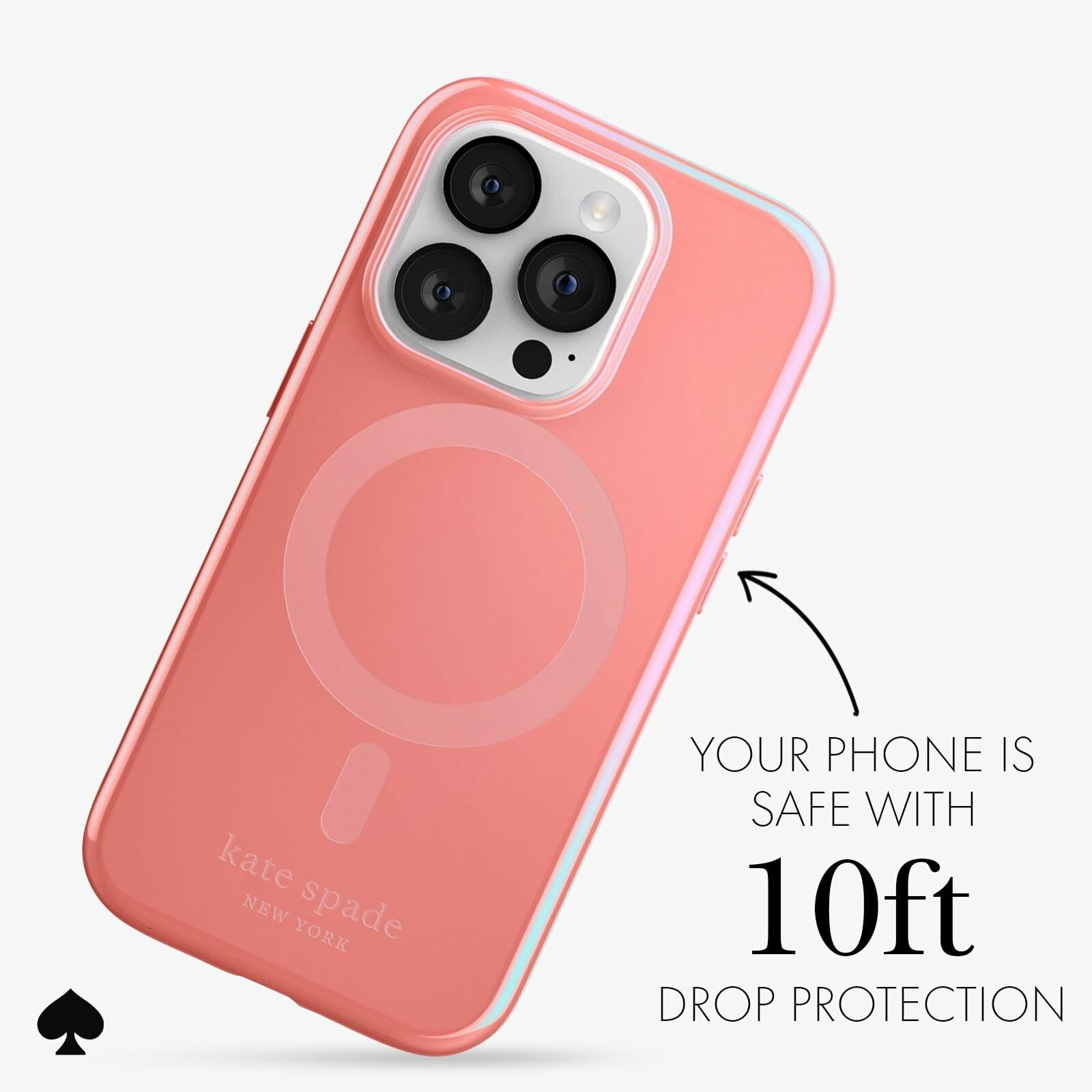 Introducing the stunning Kate Spade New York iPhone 14 Pro case with a signature grapefruit soda lacquer design. It offers top-notch protection for your iPhone 14 Pro, guarding it against drops, scratches, and everyday wear. Plus, enjoy seamless MagSafe compatibility for easy charging and accessory attachment.
